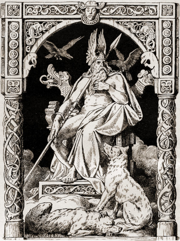 Wie der Mensch seine Hunde, so hat also auch der Allvater den Wolf gezähmt, und wir finden in der üblichen Symbolik die beiden Wölfe Geri und Freki als „Begierde und Gefräßigkeit“ zu seinen Füßen auf dem Thron der Allmacht. Man könnte sie als Gegenstücke zu den beiden Raben Hugin und Munin als „Gedanke und Gedächtnis“ betrachten, um deren Vorstellungen auch wieder zu verschlingen und aufzulösen.
