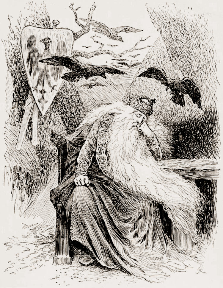 Er hatte das Wort kaum ausgesprochen, da sah man einen gerüsteten Heerhaufen herantraben, dem der feuerrote Heerschild, das Wahrzeichen des Kampfes, voranleuchtete. Ein Recke in glänzender Rüstung sprengte vor. „Heda!“, rief er, „Kommt ihr Hünen, um unser Feld zu verwüsten? Aber ihr findet uns zur Wehr bereit. Ist nun ein unverzagter Recke unter euch, der mit mir das Schwertspiel Stirn gegen Stirn versuchen will, der trete hervor!“ Von dem nun folgenden Zweikampf sangen die Barden lange Zeit, denn es war ein Kampf zwischen Vater und Sohn.