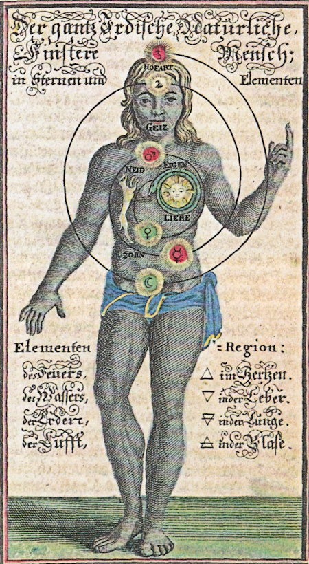 Damit wollen wir hier nicht behaupten, daß es indische Yogis waren, die unsere Märchen erzählt und lange Zeit bewahrt haben. Doch im Yoga geht es vor allem um praktische Erfahrungen und weniger um theoretische Philosophien, Systeme und Begriffe. Und diese Erfahrungen kann jeder Mensch auf seine Weise machen, egal wo er in der Welt lebt, wenn er achtsam in seinen Körper schaut. Dann findet man zum Beispiel die Erde am Ende des Darms, das Wasser in der Blase, das Feuer im oberen Darm und Magen, den Wind in der Lunge, den Raum in der Kehle, die Gedanken und die Vernunft im Kopf und Sonne und Mond als die beiden Gehirnhälften. Und wenn man noch achtsamer schaut, findet man Zentren der Gefühle, Energiebahnen, Beziehungen, Blockierungen und vieles mehr. Dafür braucht man nicht unbedingt eine Yoga-Ausbildung. Im Gegenteil, allzu viele Begriffe und Erwartungen können hier sogar destruktiv wirken. Yoga ist ein praktischer Weg. Warum sollten also unsere Vorfahren in Europa nicht ähnliche Erfahrungen gemacht haben? Denken wir zum Beispiel an das berühmte Bild von Johann Georg Gichtel (1638-1710) aus den Hochzeiten der mittelalterlichen Alchemie, als viele Menschen versuchten, durch Wandlung und Synthese der inneren und äußeren Erfahrungen den Weg zur Wahrheit, zum sogenannten „Stein der Weisen“ zu finden. So verband man zum Beispiel auf verschiedenste Weise die inneren Chakren mit den äußeren sieben Wandelsternen (Saturn, Venus, Jupiter, Merkur, Mars, Mond und Sonne) und nannte sie „Brennöfen der Seele“: [anthrowiki.at/Johann_Georg_Gichtel]: